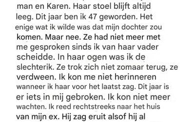 Mijn 47e verjaardag verliep in stilte, met slechts drie borden op tafel, één stoel onaangeroerd, een stille echo van de…