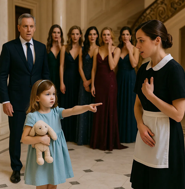 Zijn dochter Amelia, pas zes jaar oud, stond midden op de marmeren vloer in een blauwe jurk, met een knuffelkonijn in haar armen. Haar kleine vingertje was recht op Clara, de serveerster, gericht.