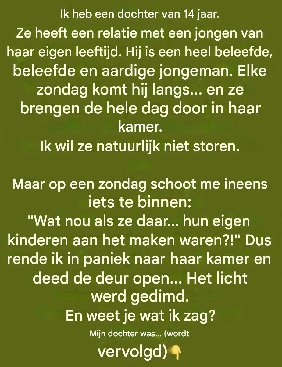 Elke zondag is het hetzelfde tafereel: mijn veertienjarige dochter sluit zich op in haar kamer met haar vriendje. Een beleefde, glimlachende jongen, altijd klaar om haar te begroeten met een perfect "Goedemorgen, mevrouw." Niets om over te klagen, eigenlijk. En toch fluistert er elke week een stemmetje in mijn hoofd: "Wat als ze iets meer zouden doen dan praten?"