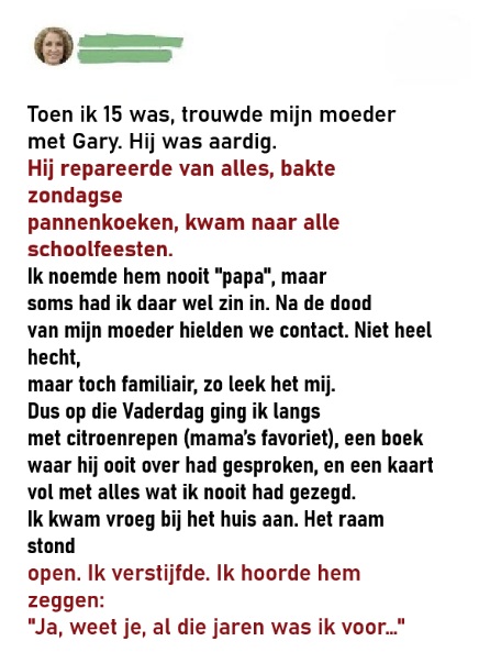 Mijn moeder trouwde met Gary toen ik 15 was. Mijn vader verdween toen ik een baby was, en het grootste deel van mijn leven waren mijn moeder en ik de enigen. Toen ze Gary mee naar huis nam, wist ik niet wat ik ervan moest denken. Maar hij was aardig en geduldig, repareerde altijd kapotte dingen in huis, verscheen op schooltoneelstukken en bakte op zondagochtend perfecte pannenkoeken. Ik noemde hem nooit ‘papa’, maar diep vanbinnen vroeg ik me af of ik dat misschien ooit zou doen.