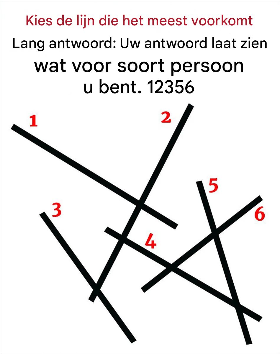 Op het eerste gezicht lijkt het een onschuldig spelletje: zes zwarte lijnen, genummerd van 1 tot en met 6, naast elkaar getekend. Jouw missie? Aangeven welke de langste lijkt. Makkelijk, toch? En toch... achter deze ogenschijnlijk onschuldige keuze schuilt een fascinerende test van je perceptie en levenshouding. Dus, klaar om te ontdekken wat je intuïtie over je onthult?