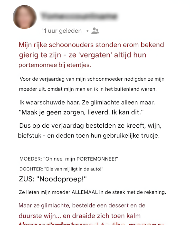 De rijke ouders van mijn man hadden de bekende gewoonte om hun portemonnee te ‘vergeten’ wanneer ze uit eten gingen – een handige misser waardoor anderen voor hun luxe maaltijden moesten betalen. Ik had het vaker meegemaakt dan ik kon tellen.