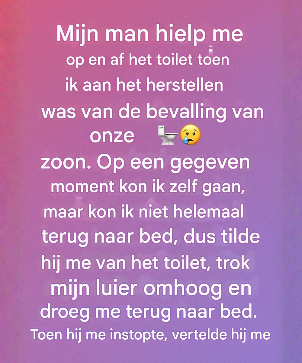 Op een avond, toen de vermoeidheid en de pijn de overhand hadden, hielp mijn man me stilletjes naar de badkamer. Ik kon niet eens zelf terug naar bed. Zonder aarzelen tilde hij me voorzichtig op, trok mijn luier weer omhoog en stopte me onder de dekens. Ik herinner me dat ik me door tranen heen verontschuldigde en me vernederd voelde, maar hij glimlachte alleen en zei zachtjes: "Dit is een van de redenen waarom ik nog meer van je hou."