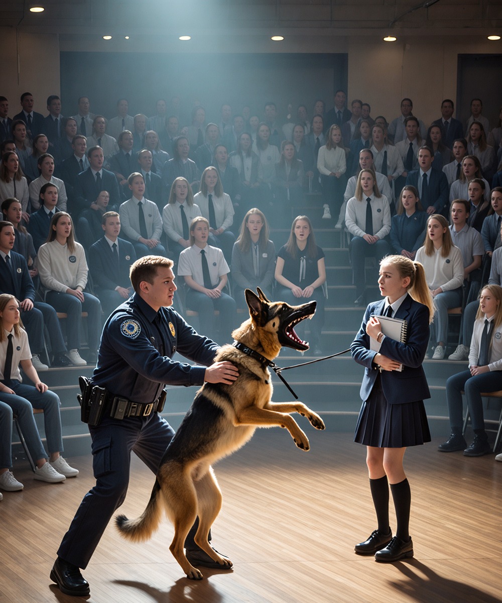 Op City High School nr. 17 werd een « open les » over veiligheid georganiseerd. Leerlingen, leraren en ouders verzamelden zich in de grote aula, nieuwsgierig naar wat er ging gebeuren. Een politieagent betrad het podium in vol ornaat, met zijn partner – een Duitse herder genaamd Rex – kalm naast zich.