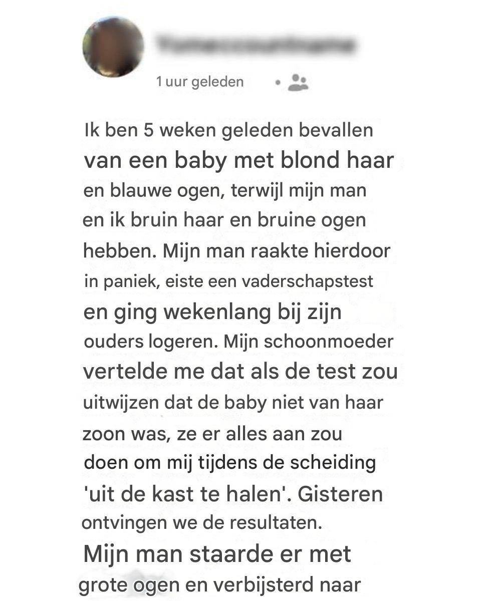 Maar in plaats van vreugde zag ik verwarring en achterdocht op zijn gezicht verschijnen. Binnen een paar uur werd zijn warmte koud. Hij begon alles in twijfel te trekken, ook mij. Zijn twijfels namen zo snel toe dat hij een vaderschapstest eiste en bij zijn ouders ging logeren. Wekenlang zat ik alleen voor onze pasgeboren baby, terwijl mijn schoonmoeder me koeltjes waarschuwde dat als de test zou bewijzen dat de baby niet van hem was, ze "ervoor zou zorgen dat ik de prijs zou betalen".