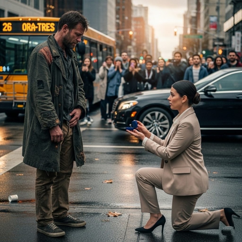 Een lichte regenbui hing in de lucht terwijl mensen zich haastten, met opgeheven paraplu’s en neergeslagen ogen – maar niemand merkte de vrouw in het beige pak op die midden op de kruising op haar knieën viel. Haar stem trilde. « Alsjeblieft… trouw met me, » fluisterde ze, terwijl ze een fluwelen doosje vasthield.