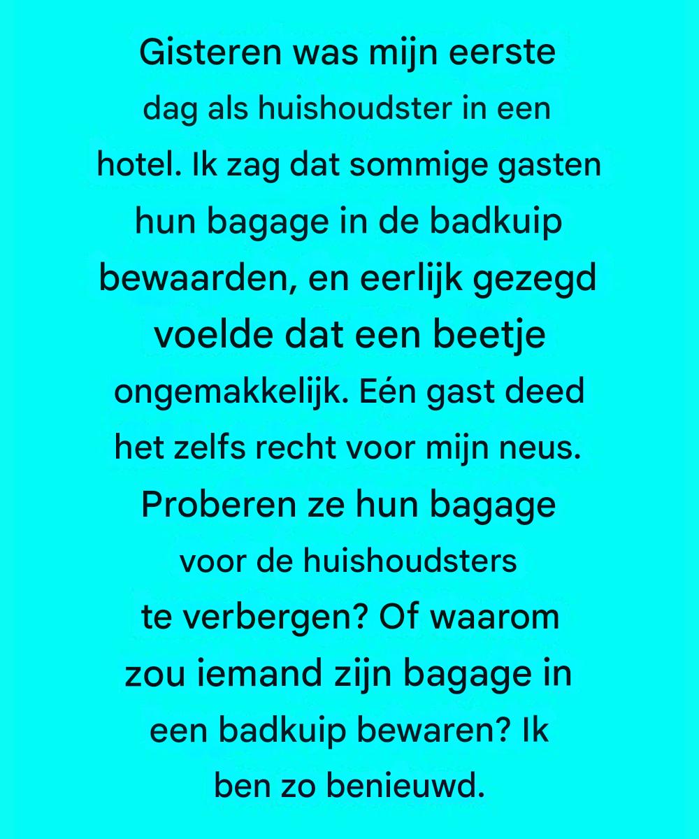 Maar terwijl ik van kamer naar kamer liep, begon me iets vreemds op te vallen. Gasten – zakenmensen, gezinnen, zelfs individuele reizigers – zetten allemaal hun koffers in de badkuip.